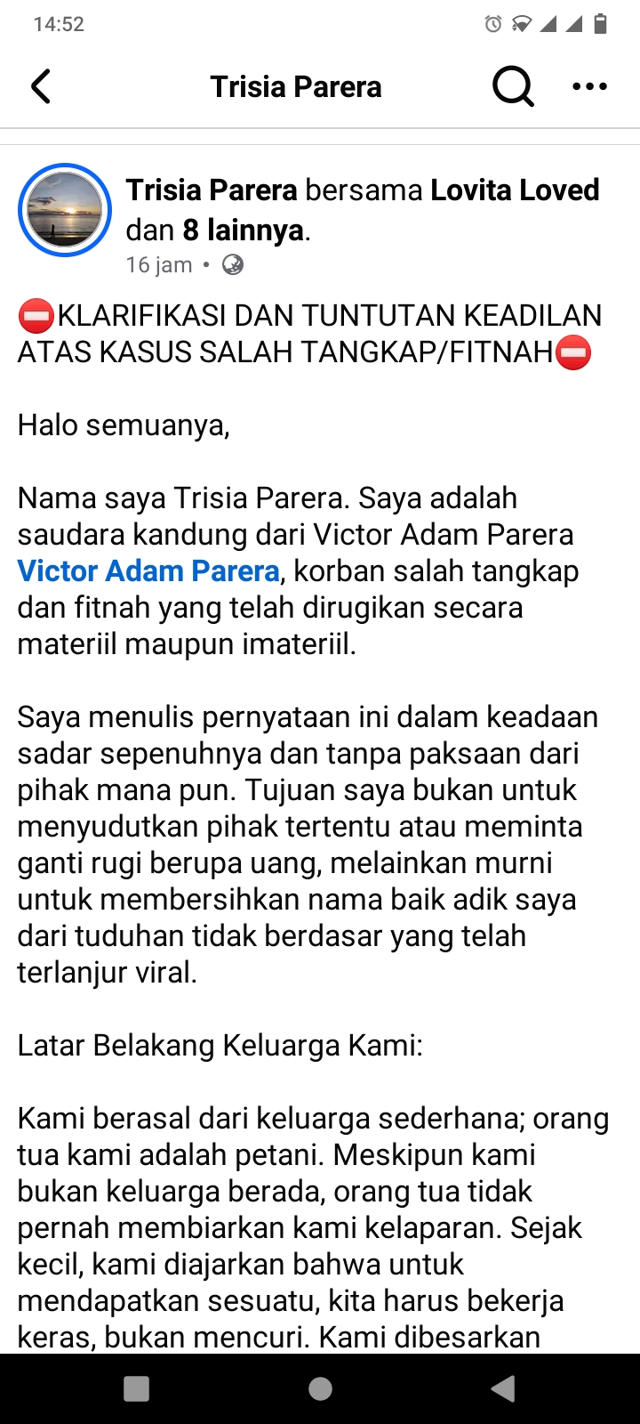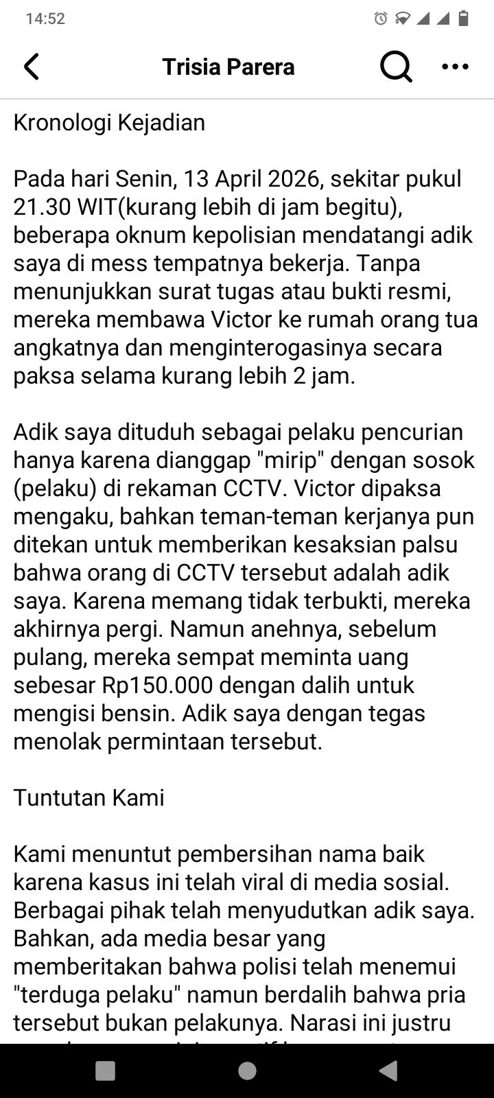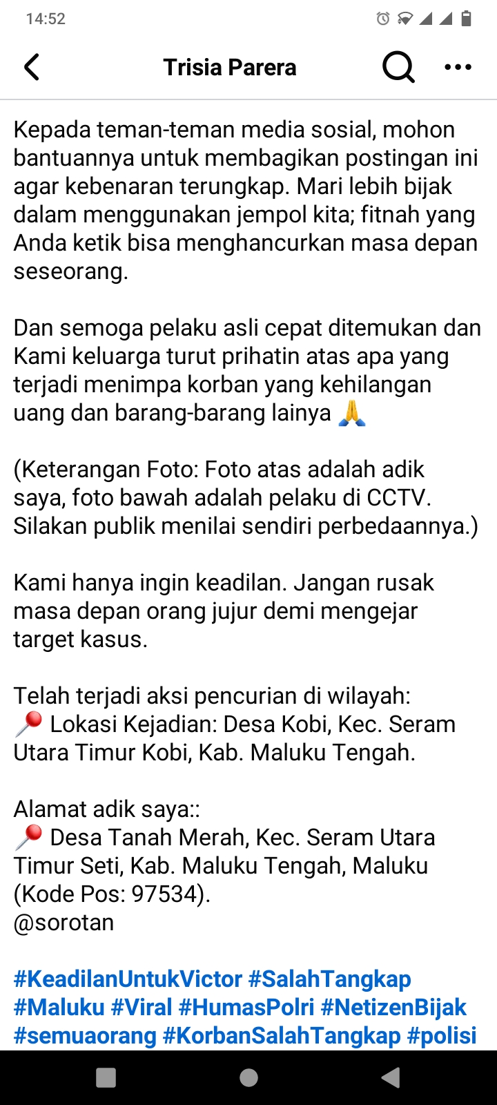 Ambon | Maluku.Newsline.id – Keluarga Victor Adam Parera menyampaikan klarifikasi sekaligus tuntutan keadilan atas dugaan salah tangkap dan fitnah yang disebut telah merugikan korban secara materiil maupun immateriil. Klarifikasi tersebut disampaikan melalui unggahan akun Facebook Trisia Parera sekitar 16 jam lalu.