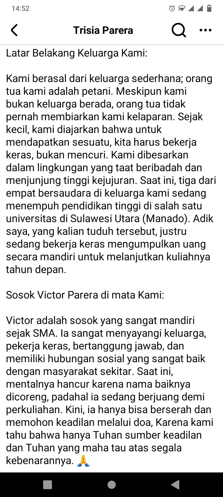 Ia menjelaskan, keluarga mereka berasal dari latar belakang sederhana dan menjunjung tinggi nilai kejujuran. Victor, menurutnya, dikenal sebagai pribadi pekerja keras yang tengah berupaya mengumpulkan biaya untuk melanjutkan pendidikan.