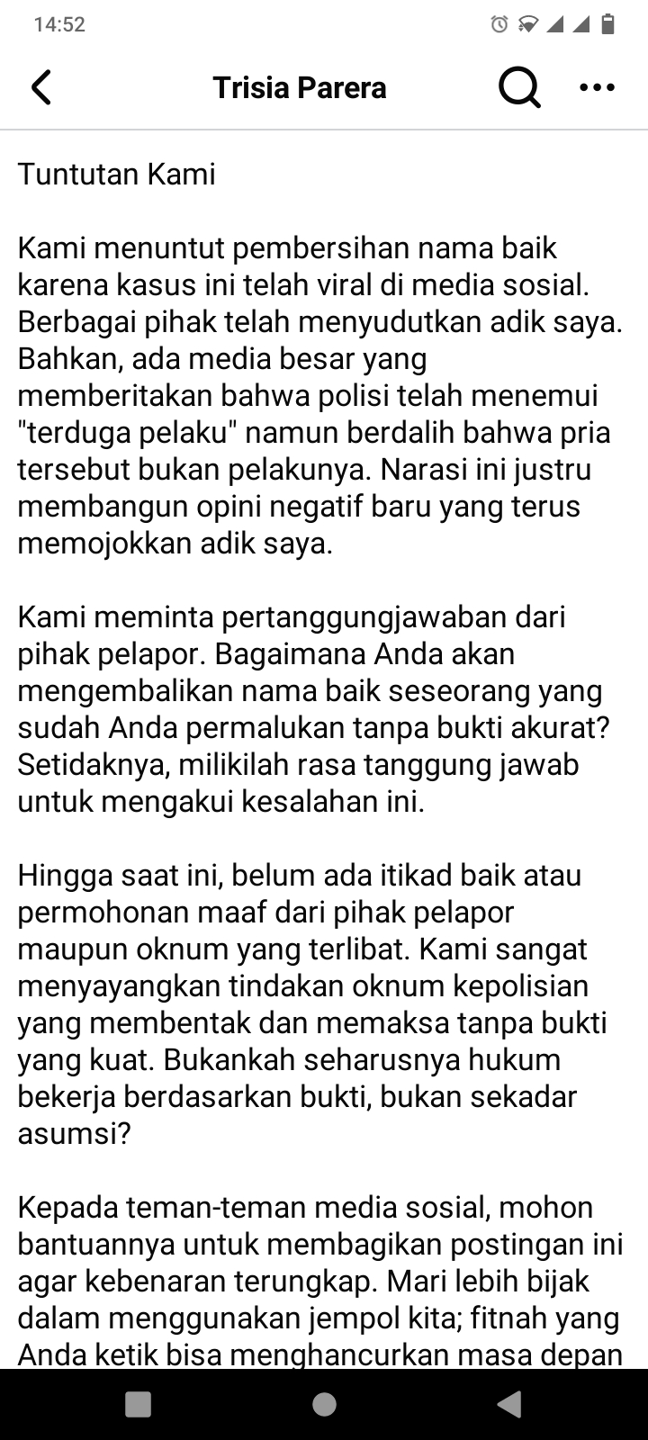 “Tujuan kami bukan untuk menyudutkan pihak tertentu atau meminta ganti rugi berupa uang, melainkan murni untuk membersihkan nama baik adik saya dari tuduhan tidak berdasar,” tulisnya.