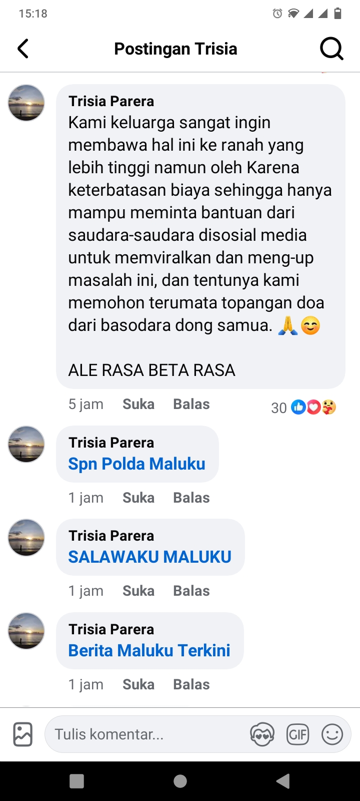 “Kami keluarga sangat ingin membawa hal ini ke ranah yang lebih tinggi namun oleh karena keterbatasan biaya sehingga hanya mampu meminta bantuan dari saudara-saudara di sosial media untuk memviralkan dan meng-up masalah ini, dan tentunya kami memohon terutama topangan doa dari basodara dong samua,” tulisnya.