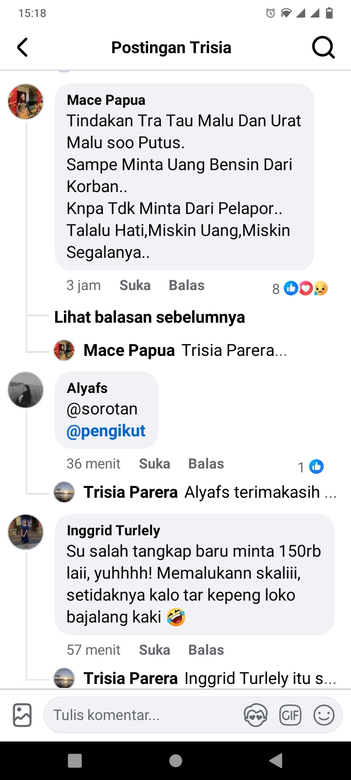 “Tindakan tra tau malu dan urat malu su putus. Sampe minta uang bensin dari korban. Knapa tdk minta dari pelapor. Talalu hati, miskin uang, miskin segalanya,” tulis akun Facebook mace Papua.