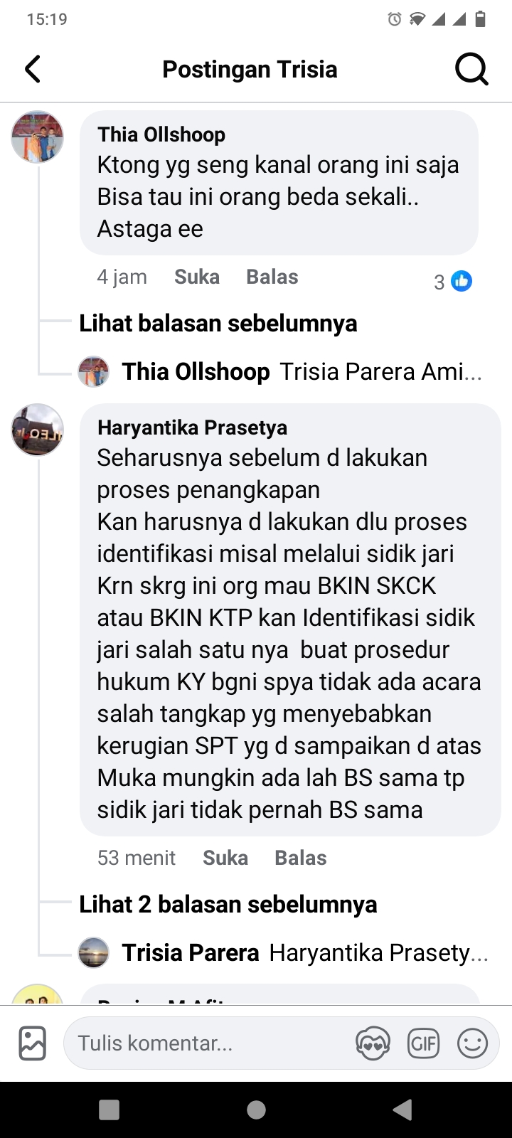 Selain itu, ada pula warganet yang menyinggung pentingnya prosedur identifikasi dalam penegakan hukum. “Seharusnya sebelum dilakukan proses penangkapan, harusnya dilakukan dulu proses identifikasi misalnya melalui sidik jari. Karena sekarang ini orang mau bikin SKCK atau KTP saja ada identifikasi sidik jari sebagai prosedur hukum supaya tidak ada salah tangkap yang menyebabkan kerugian seperti yang disampaikan di atas,” tulis akun Facebook haryantika prasetya.